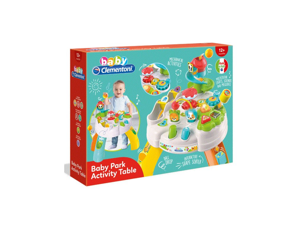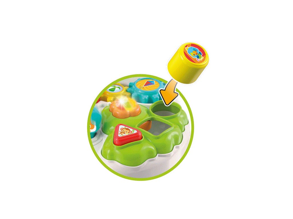 CLEMENTONI Clemmy baby - Veselý hrací stolek s kostkami a zvířátky zabaví Vaše děti po dlouhý čas. Hrací stoleček s mnoha aktivitami, jejichž cílem je stimulovat interakci s dítětem. Vkládací tvary se světly a zvuky, otáčející se ozubená kolečka a tlačítka ovládající pejska a kočku. Součástí stolku je zábavná trasa pro míčky se spoustou úžasných skluzavek a překážek. Míčky končí svou jízdu v noze stolku. Hračka stimuluje manuální dovednosti, vizuální vnímání a rozpoznávání vztahu mezi příčinou a následkem. Baterie: 3x1,5V AG13/R44 (součástí výrobku jsou baterie pouze demonstrativní účely). Rozměr balení: 58 x 44 x 12,5 cm. Věk: 12m+