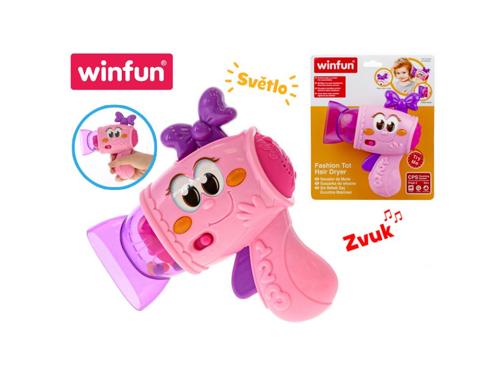 Růžové chrastítko v podobě fénu na vlasy o velikosti 15 cm.