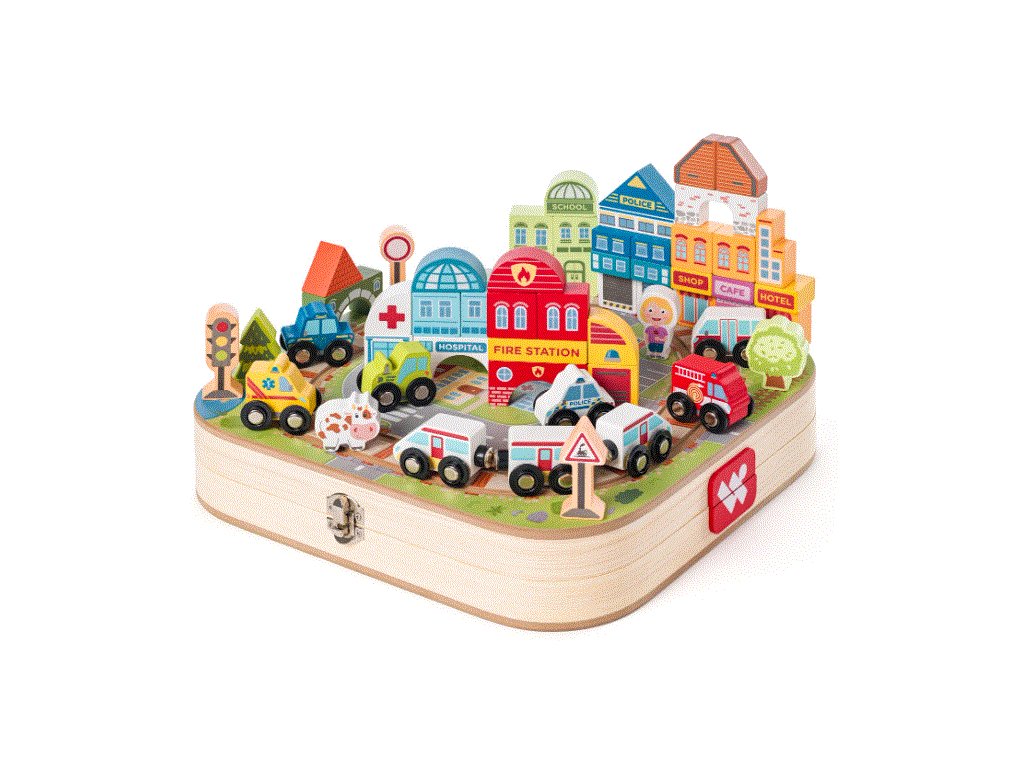 Otevřete kouzelný svět železnic v dřevěném kufříku! Po jeho rozložení vznikne na obou stranách jeho víka krajina s dráhou ve tvaru osmičky s vyfrézovanými kolejemi. Dřevěný vláček, dřevěná autíčka a kostky pro stavbu domečků tvoří dokonalou herní sadu v jedinečném designu od české výtvarnice. | Věk: 3+ | Rozměr rozloženého kufříku: 62 × 32 cm | Počet dílů: 55