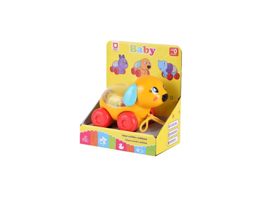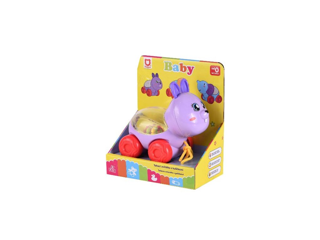 Veselé zvířátko na kolečkách s barevnými kuličkami. Taháním či pohybem zvířátka začnou kuličky uvnitř poskakovat. Tato hračka zaujme a pobaví i ty nejmenší děti.