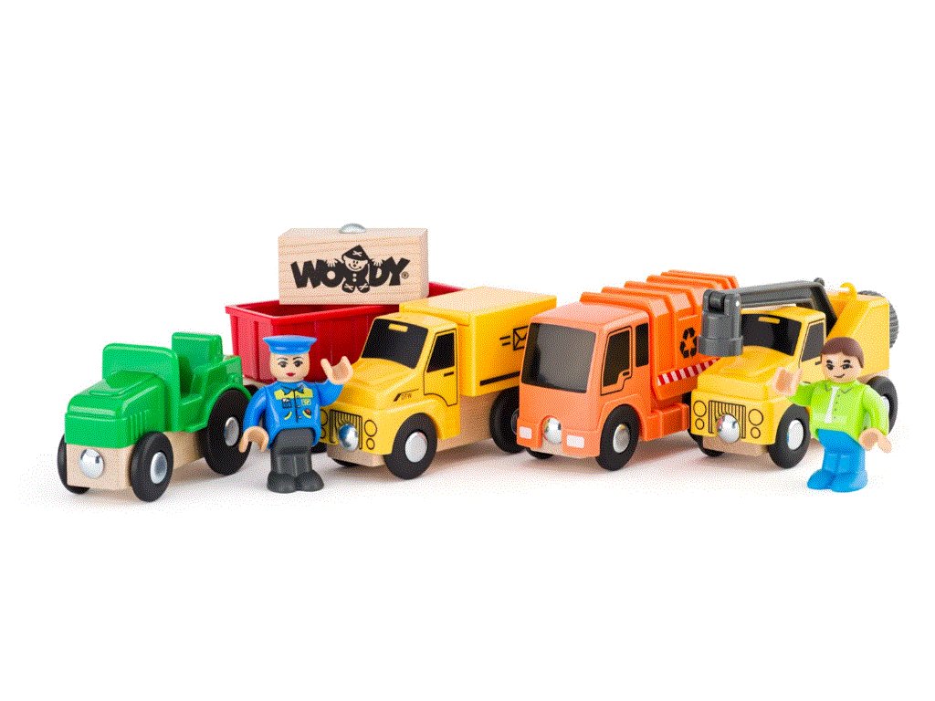 Sada 4ks užitkových dřevěných autíček a dalšího příslušenství jako doplněk k vláčkodráze nebo samostatnou hru s auty. Zahrnuje poštovní auto, traktor, jeřáb a popelářské auto. Dále 2 panáčky, vagónek s nákladem. Tato sada vozidel se bude hodit pro kluky do pokojíčku.