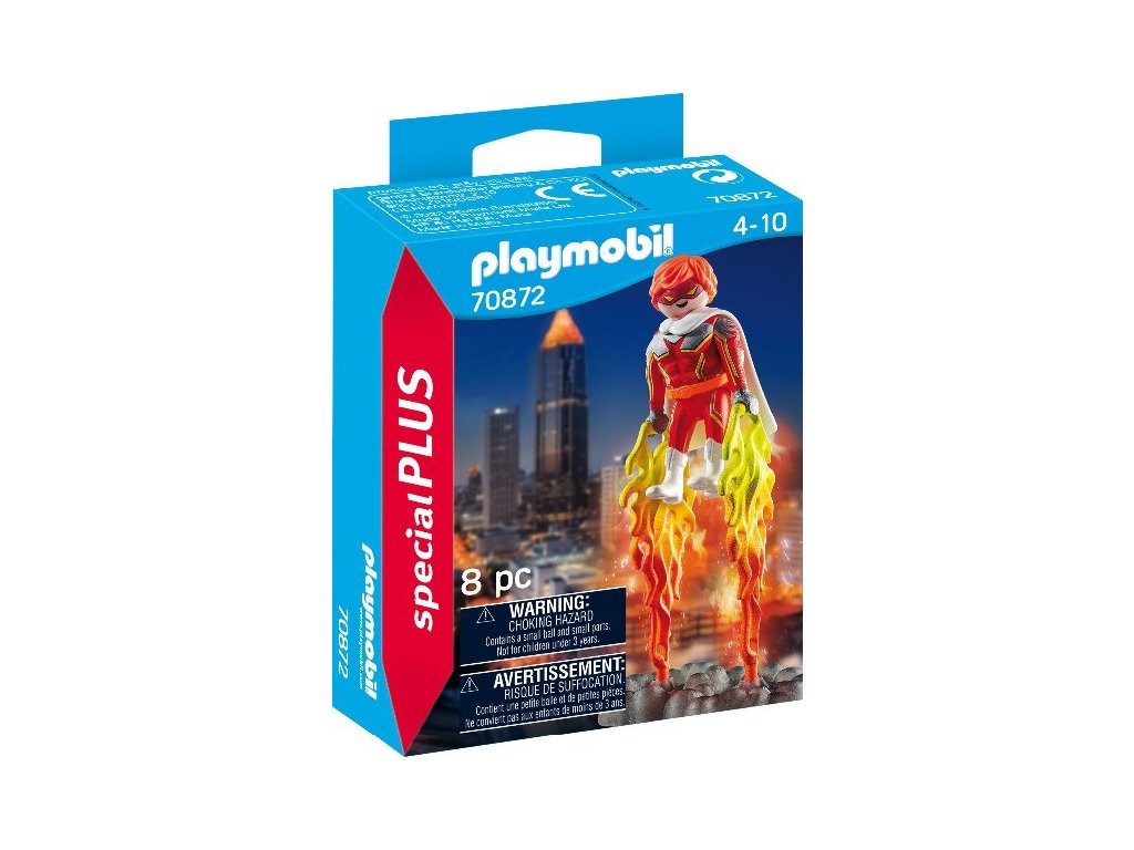 Superhrdina s plameny, které ho drží ve vzduchu.