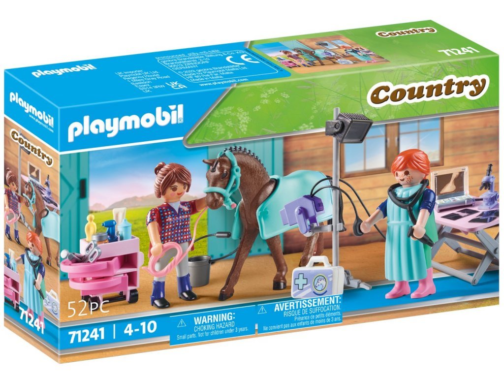 Stavebnice obsahuje dvě postavičky, koně, mobilní rentgen, skříňku se lékařským vybavením a stolek s notebookem a mikroskopem.