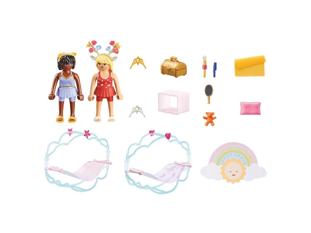 - Hračka s okouzlující princeznou, dvěma figurkami PLAYMOBIL, dvěma mráčky s houpacími sítěmi, ozdobnými hvězdami, truhlou s pokladem a mnoha skvělými doplňky pro nápadité hraní v dětském pokoji.