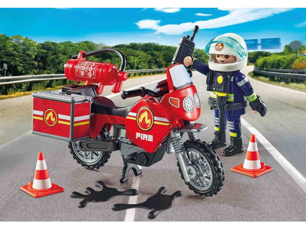 Hasič na své hbité motorce projíždí zácpou a zajišťuje místo nehody kužely. Pohyblivá řídicí vidlice a stojan nabízí realistickou zábavu, zatímco figurka bezpečně sedí na motocyklu. Hasicí přístroj a zavazadlový box lze připevnit na stranu za sedadlem a lze je přenášet v demontu. Odnímatelné nástavce na rukavice, helma s pohyblivým štítem a hrudní pancíř umožňují detailní hraní rolí.