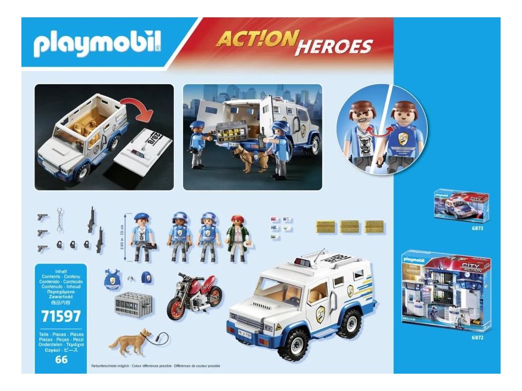 Obsahuje transportér, čtyři figurky Playmobil, policejního psa, motorku a spoustu dalšího příslušenství.