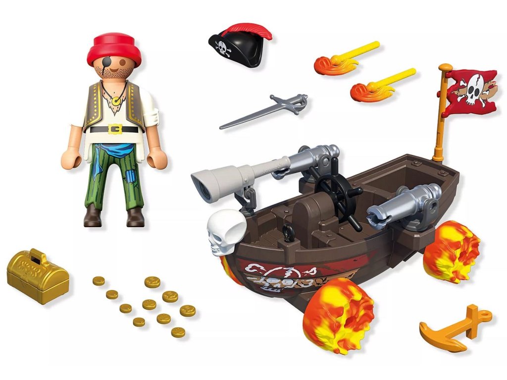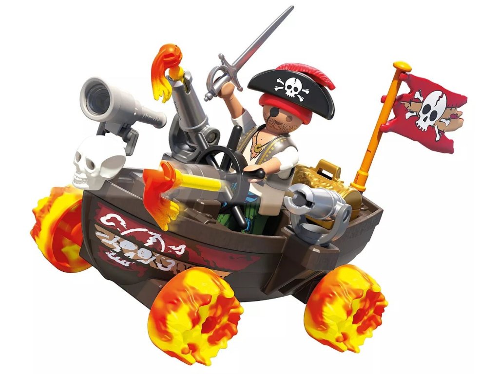 Pirátský člun zaujme svými dvěma děly, která se používají v napínavých námořních bitvách, a po souši se pohybuje na čtyřech větrnících. Statečný pirát, vybavený dalekohledem, stojí u kormidla a připraven objevit další poklad. Truhla s pokladem je úhledně uložena na palubě a kotva je vždy připravena bezpečně ukotvit člun. Ať už se jedná o napínavé bitvy nebo tajemné expedice – Rychlý pirátský člun nabízí fantastickou zábavu pro děti od 4 let!