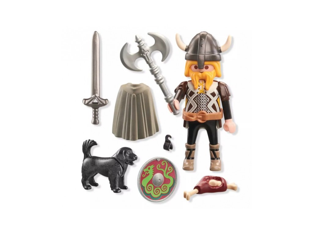 PLAYMOBIL Special Plus Vikingský válečník se štítem, mečem a sekerou. Vikinga doprovází jeho věrný hlídací pes, který je odměněn lahodnou masovou kýtou. Připraveni na epická dobrodružství: PLAYMOBIL Viking a jeho věrný hlídací pes! Tento statečný válečník, vybavený mečem, štítem a působivou dvojitou sekerou, kterou lze bezpečně připevnit k jeho plášti, je připraven na jakoukoli výzvu. Jeho věrný hlídací pes je vždy po jeho boku a ohromí svou ohebnou tlamou – ideální pro nošení kyje nebo pro odměňování se za věrnost chutnou kostí. Společně tvoří dokonalý tým, ať už brání svou vesnici nebo podnikají odvážné výpravy. Ideální pro vynalézavé děti, které milují akci a dobrodružství: Tato sada PLAYMOBIL Special Plus slibuje hodiny zábavy a vzrušujících her na hrdiny!