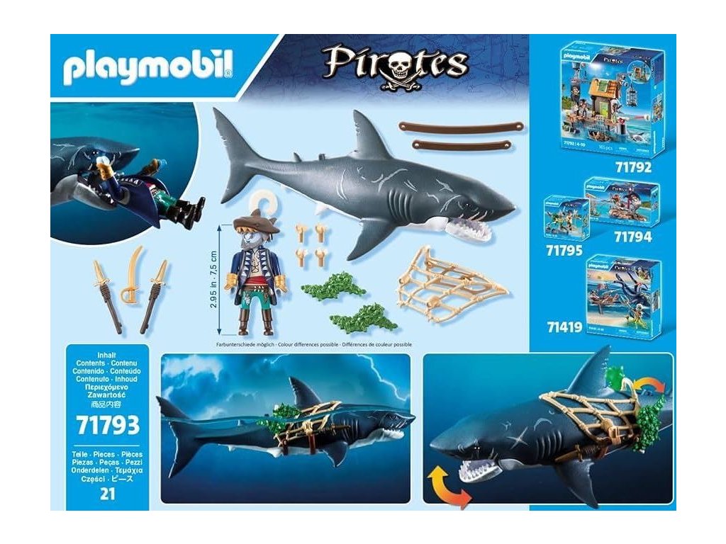 Žralok velký umí plavat ve vodě. Ponořte se do vzrušujících námořních dobrodružství s obřím žralokem a pirátem PLAYMOBIL! Toto děsivé duo je připraveno otřást vodami. Obří žralok se svými cvakajícími čelistmi dokáže chytit nic netušící kořist, zatímco odvážný pirát se drží sítě, ozbrojený dýkami a připravený k boji. Zbraně lze připevnit k síti a plavecký žralok zajistí, že akce nikdy neskončí. Perfektní pro imaginativní dobrodružství: Tato sada PLAYMOBIL kombinuje hrůzostrašné mořské tvory a dobrodružné piráty pro nekonečné hodiny hry na širém moři. Nechte kreativitu svého dítěte dobýt moře!
