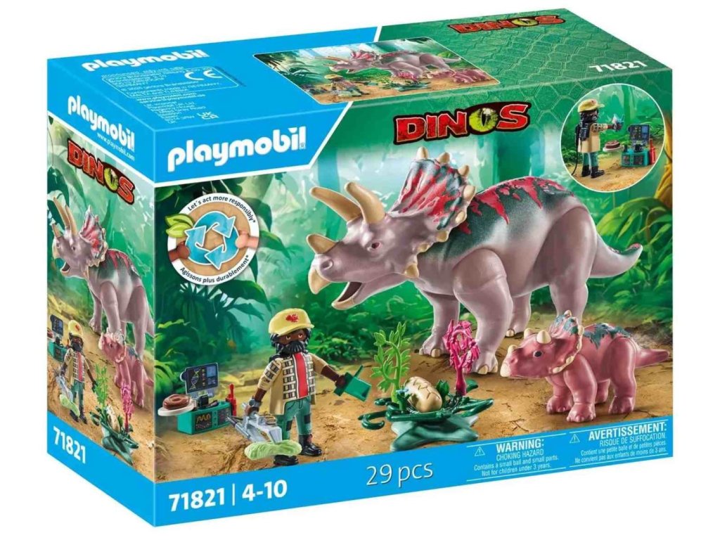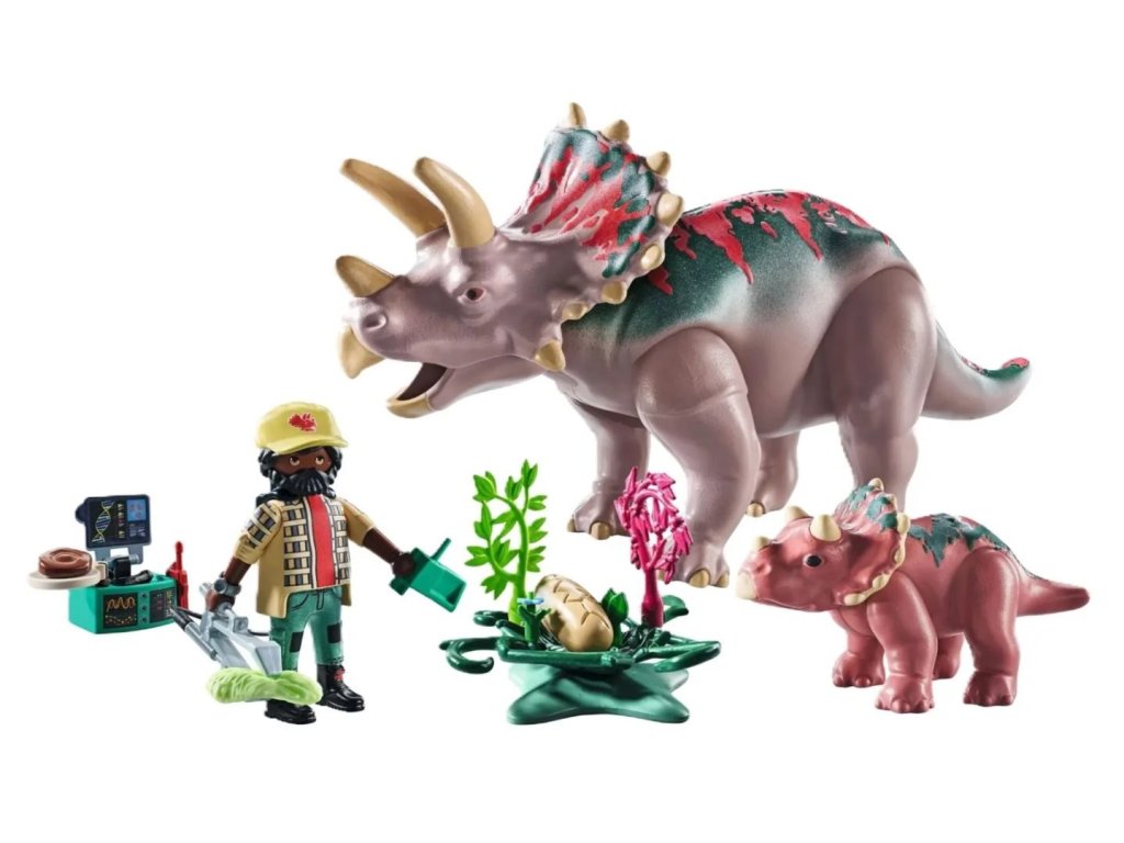 Cestujte zpět v čase s rodinou PLAYMOBIL Triceratops! Tato vzrušující sada vás zavede do fascinujícího světa dinosaurů. Pohyblivý Triceratops a jeho roztomilé miminko vás zvou k objevování a žasnutí. S krmnými kleštěmi můžete krmit dinosaury nebo jednoduše studovat jejich chování zblízka. Odnímatelné rostliny a skvělé doplňky, jako je dinosauří vejce a výzkumné zařízení, nabízejí nekonečné možnosti pro imaginativní příběhy. Vzrušující fakta o dinosaurech se dozvíte na přiložené kartě znalostí.
