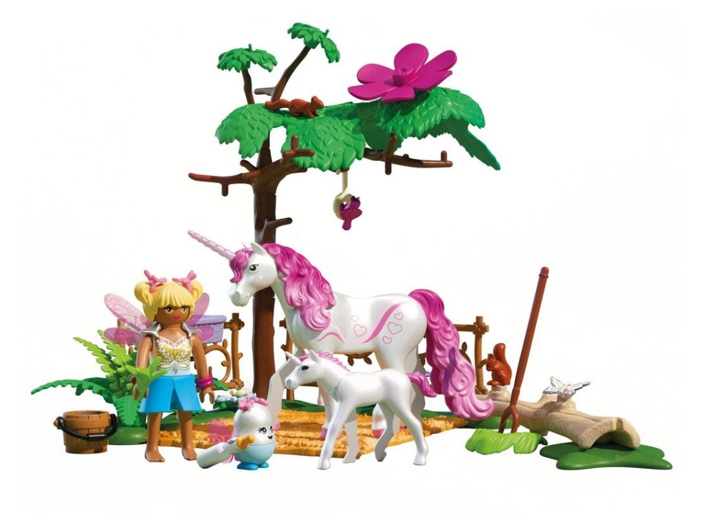 Staňte se součástí tohoto okouzlujícího příběhu a doprovázejte vílu na její cestě! Na snové lesní mýtině na vás čeká skrytý ráj – domov laskavého jednorožce a jejího hravého hříběte. Pod listnatými baldachýny se odehrávají magické okamžiky, kdy se víla a její radostný společník starají o své mystické přátele. Lahvička mléka, šplouchnutí vody a spousta mazlení oživují scénu.