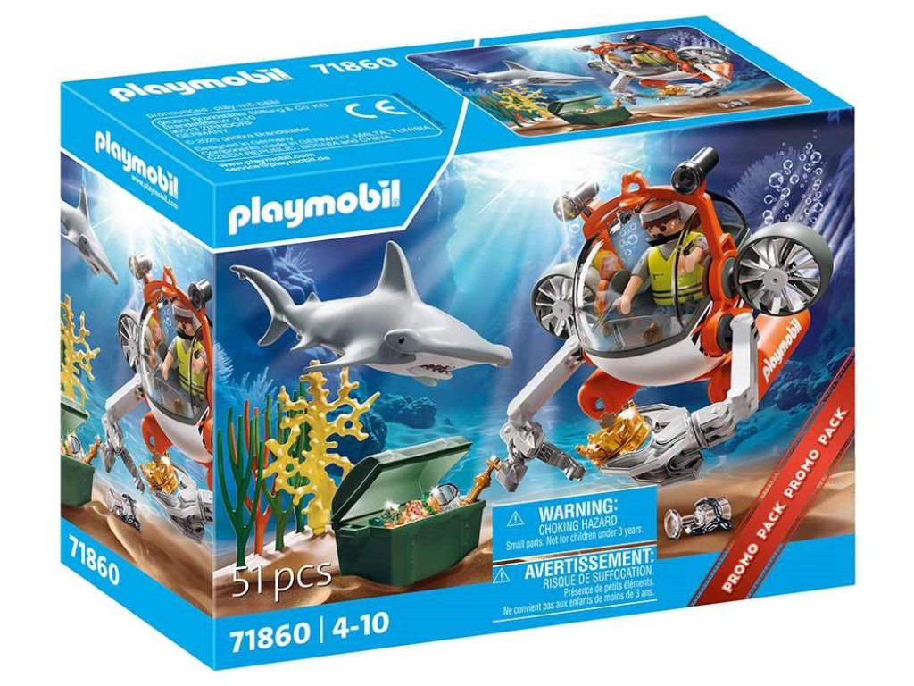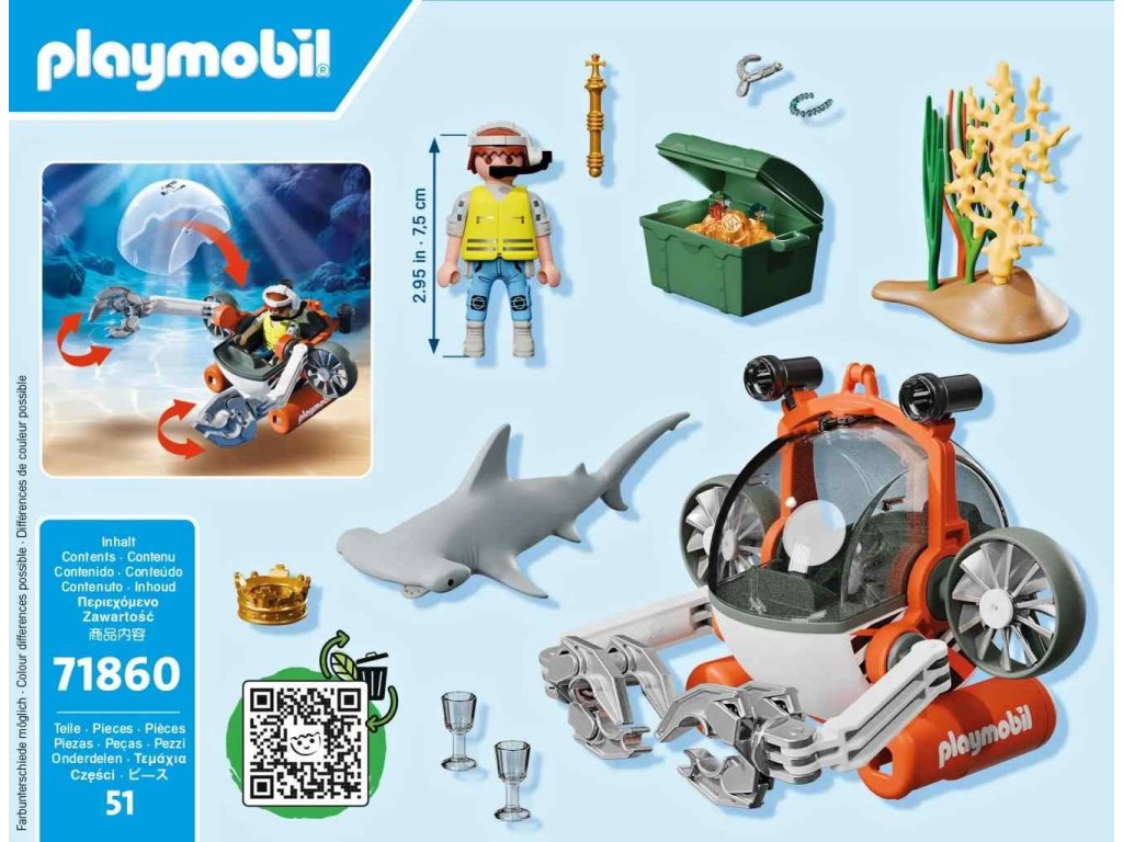Ponoř se do dobrodružství! Připrav se na vzrušující honbu za pokladem v hlubinách moře! Díky pohyblivým úchopným ramenům a odnímatelné kopuli je ponorka PLAYMOBIL dokonale vybavena k vyzvednutí třpytivých pokladů z mořského dna. Ale pozor – tajemnou truhlu s pokladem střeží žralok kladivoun! Podaří se kapitánovi uniknout? Díky chytré funkci vztlaku se ponorka může vznášet nebo potopit – stejně jako skutečná! S lesklými drahokamy, korály a tajemnými relikviemi nabízí tato sada spoustu zábavy pro malé hlubinné potápěče – skutečné dobrodružství pod vlnami, které vyžaduje odvahu a objevitelského ducha!