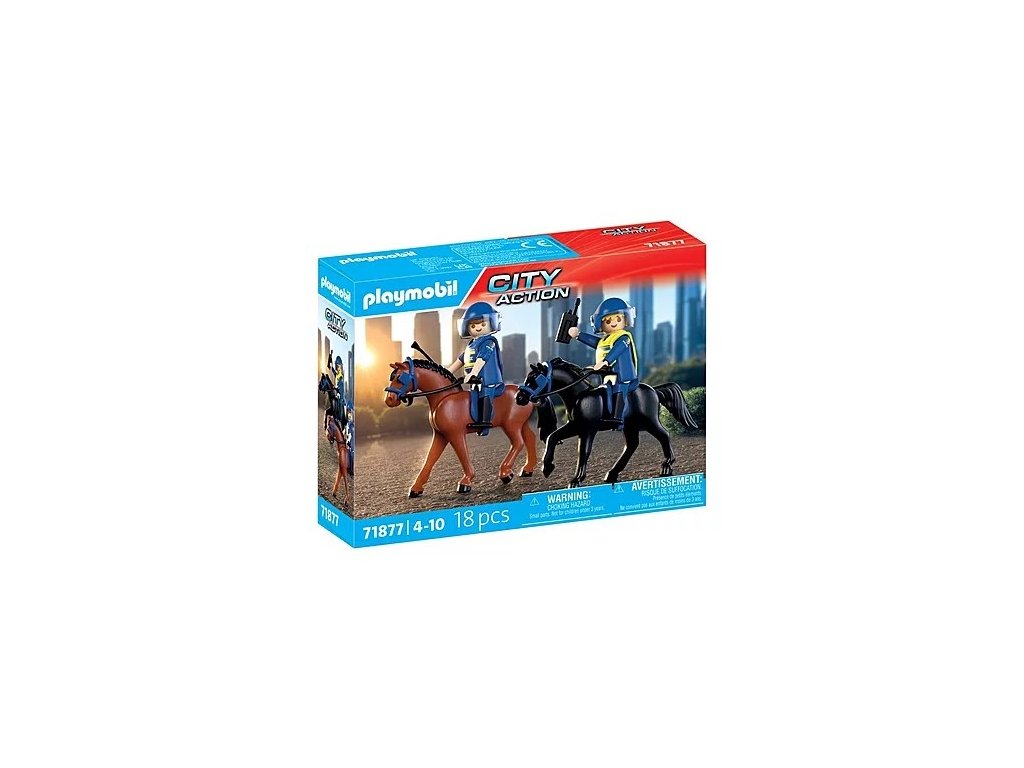 Pro společné operace si přinášejí rozsáhlé policejní vybavení. Na hlídce na koni – jízdní policejní jednotka je v pohybu! Clip-Clop – tady je policie PLAYMOBIL na koni! Policistka a policista hlídkují v ulicích města na svých plně vybavených koních. Součástí sady je: vysílačka, svítilna a odnímatelné vesty pro každé použití. Přilby se skládacími štíty zajišťují jasná hlášení a sedlo a ohlávka nabízejí bezpečnou oporu.