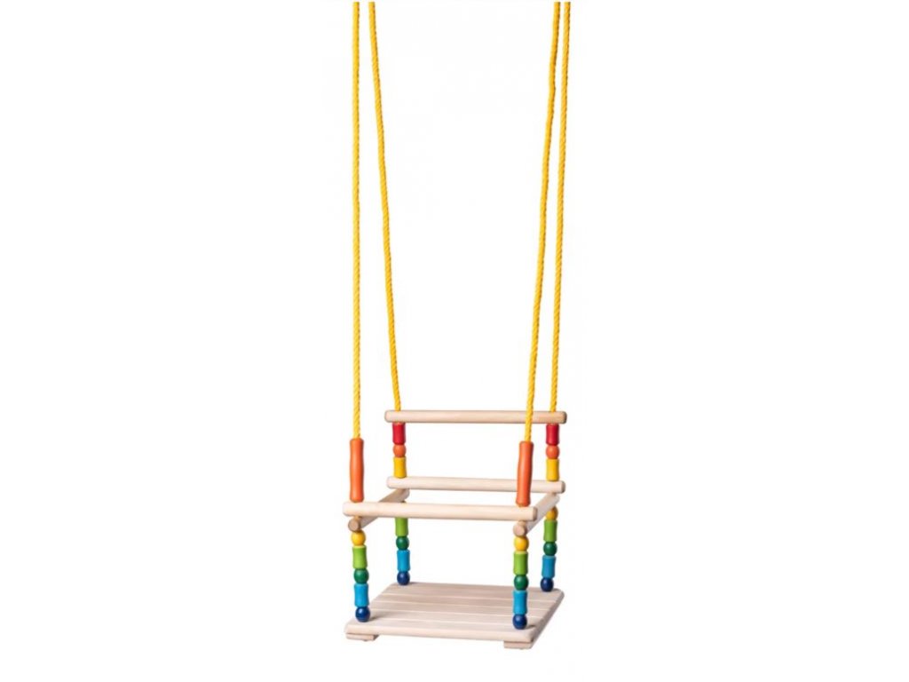 Houpačka pro nejmenší děti je vyrobena z masivního dřeva. Je opatřena bezpečnostní ohrádkou. Zvednutím přední tyčky ohrádky se dítě snadno dostane dovnitř i ven. Houpačka má nastavitelnou délku lan. Je vhodná do interiéru i exteriéru. Je určena pro zavěšení na bezpečnostní (nejlépe točivé) háky, které však nejsou součástí balení. Vyrovná se uvolněním šňůry.