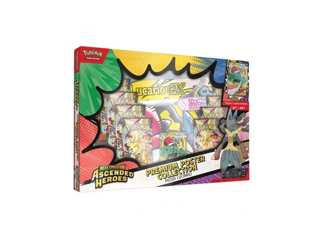 Pokémon Ascended Heroes Mega Lucario Premium Poster Collection je speciální produkt obsahující 10 Pokémon booster balíčků, 1 promo kartu a 1 oboustranný plakát.