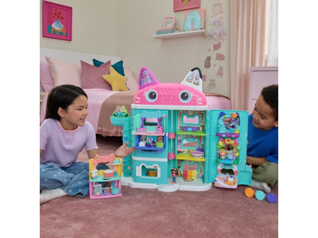 Prozkoumejte okouzlující svět Gábinina kouzelného domku pro oslavy, 60cm vysokého mistrovského díla s duhovým motivem! Popusťte uzdu kreativitě s 9cm figurkou Gábi, nábytkem do kouzelného domku a 10 doplňky, jako je toaleta s kočičím motivem, klavír nebo DJ stůl a mnoho dalšího! Zahrajte si na dýdžejském stole a využijte kočičí výtah pro vstup do šesti místností a na střešní hřiště. Vhoďte zásilky do doručovací věže a stiskem tlačítka objevte tajné poklady. Poté otevřete kouzelný domek a poslechněte si 6 zvukových efektů ze seriálu. Hračky Gábinin kouzelný domek pro dívky a chlapce jsou skvělými dárky pro všechny děti, které jsou fanoušky tohoto seriálového hitu od Netflixu a rádi si hrají s domečky pro panenky. Zajistěte jim nezapomenutelný zážitek se světem roztomilých figurek, doplňků a nábytku do kouzelného domku, které mohou sbírat a libovolně skládat! Postavte si vlastní svět se základními stavebnicemi, jako je kuchyňka na hraní nebo hudební místnost, a spoustou sběratelských předmětů, jako je úžasná výletní loď, mořskovílí bazén a zbrusu nová souprava Párty pokoj – podkroví kouzelného domku s krytým skateparkem a roztomiloučkými balkónky s mini hračkami. Poskytují uspokojivou senzorickou hru a lze je bezproblémově zkombinovat s oběma verzemi kouzelného domku!