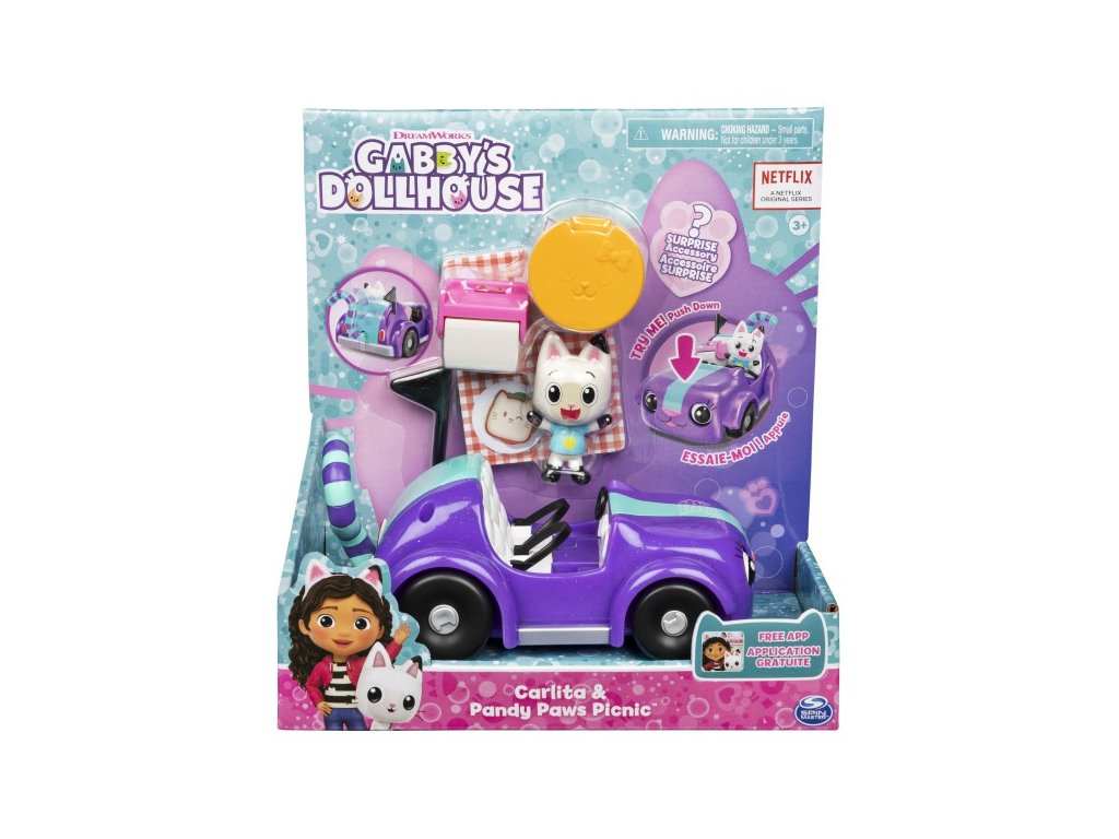 Autíčko Carlita je napůl kočka a napůl auto. Na sedadla se vejde Pandy i další postavička z Gábininy Kouzelného domku. Jezdi s Carlitou a ona bude vrtět ocáskam. Zatlač na kapotu a ona mrkne. Zatlač na levou a pravou stranu, aby se podívala doleva a doprava. Sada obsahuje autíčko, figurku Pandyho, piknikovu deku, chladící box a krabičku s překvapením. Vhodné od 3 let.
