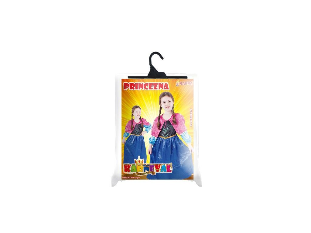 Překrásný dívčí kostým pro všechny sněhové princezny! Kostým ve velikosti S je určen pro holčičky ve věkovém rozmezí 4-6 let (100-116 cm). Velikost se může lišit od vyobrazení na obalu. Kostýmek je ušit v černo-modrých barvách, v horní částí je zdoben potiskem, zlatým lemováním kolem pasu. Součástí je také růžový plášť na mašličku.