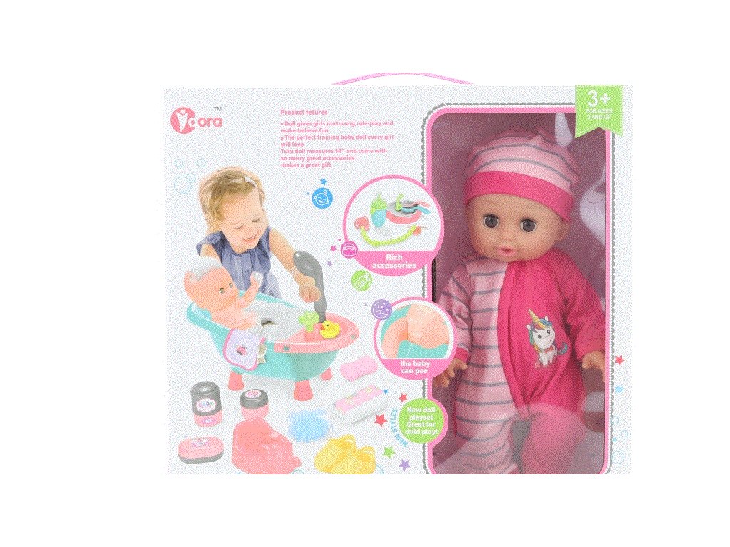 Roztomilé miminko pro malé maminky. Panenka se ráda koupe ve své dětské vaničce. Balení obsahuje šampón, mýdlo, pěnu do koupele, nočník a další věci potřebné ke koupání. K vaničce jsou potřeba 3 baterie AG13/LR44 (1,5V), které jsou součástí balení. Rozměr balení cca 35 x 35 x 15 cm. Velikost panenky cca 28 cm. Věk 3+