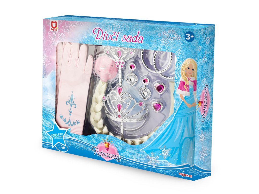 Exkluzivní sada pro všechny malé princezny! Krásná korunka s náušnicemi, prstýnky, hůlkou, náramky a rukavicemi. Doplňky jsou zdobeny růžovými prvky. Součástí je dlouhý cop v blond provedení. Perfektní sada ke kostýmu! Doporučeno pro děvčata od 3 let.