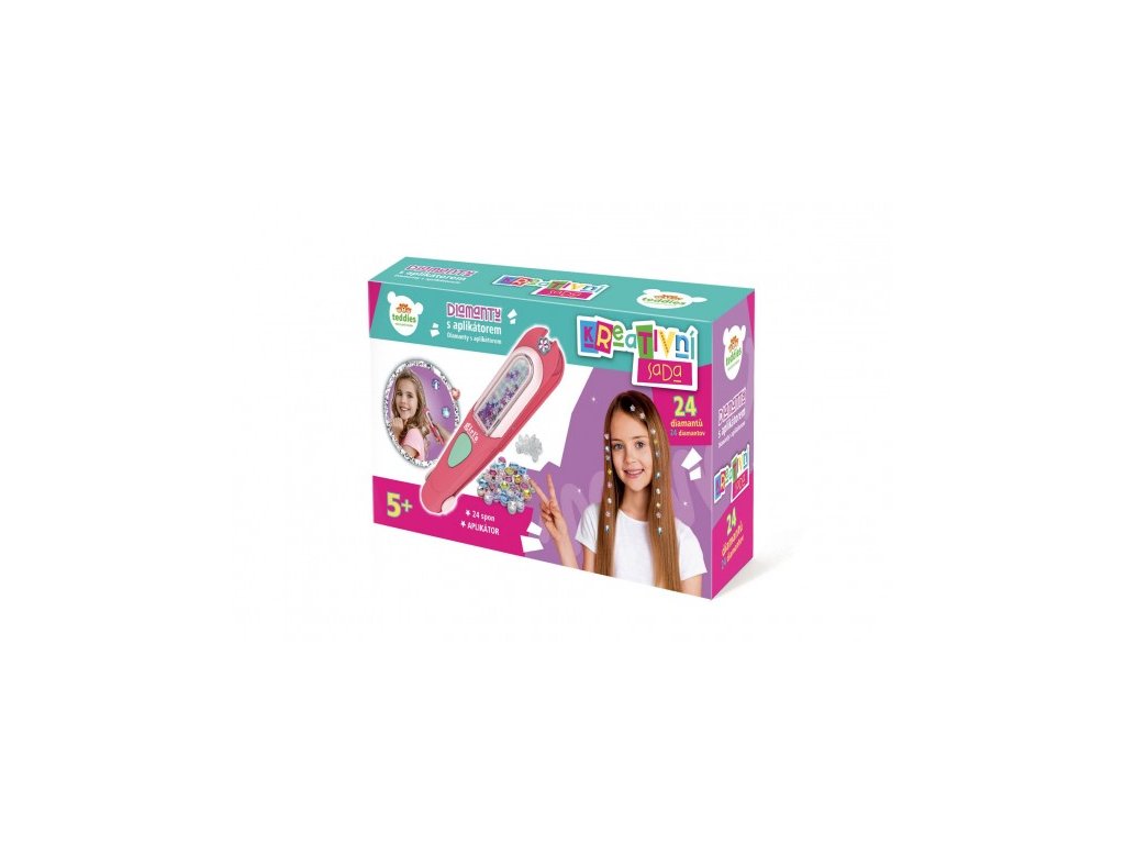 Kreativní sada 24 diamantů a 24 spon s aplikátorem. Diamant vložte do vrchní části aplikátoru. Do spodní části vložte přezku. Do přezky ve spodní části vložte slabý pramen vlasů a umístěte ho tam, kde chcete diamant připevnit. Zmáčkněte aplikátor, abyste diamant na vlasech zafixovali přezkou. Drahokam zůstane na pramenu vlasů připevněný. Rozměry balení 22 x 12 x 6 cm Vhodné pro děti od 5 let