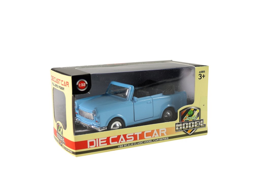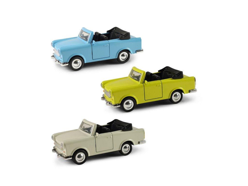 Kovové auto trabant kabriolet v různých barvách. Auto jezdí na zpětný setrvačník. Nostalgie na čtyřech kolech. Měřítko 1:32.