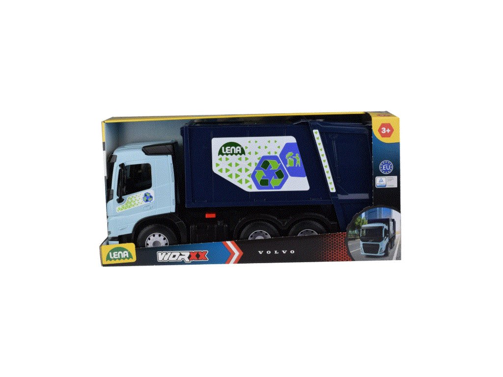 Auto popelářské WORXX Volvo má 6mm tlusté kovové osky u kol. Součástí je pojistka proti nežádoucímu vyklopení. 1x malá a 1x velké popelnice.