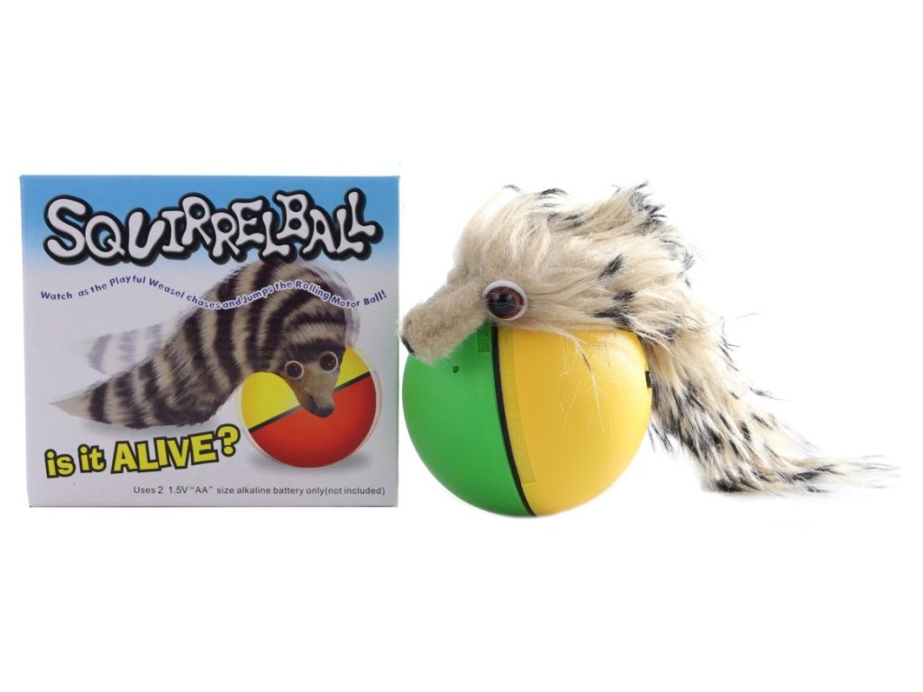 Fretka s míčkem na baterie ( 2xAA, nejsou součástí). Po zapnutí se míček hýbe a s ním i fretka. Baleno v papírové krabičce. Rozměry krabičky 12,5x8,5x8,5 cm. Průměr míčku 8 cm. Věk 3+