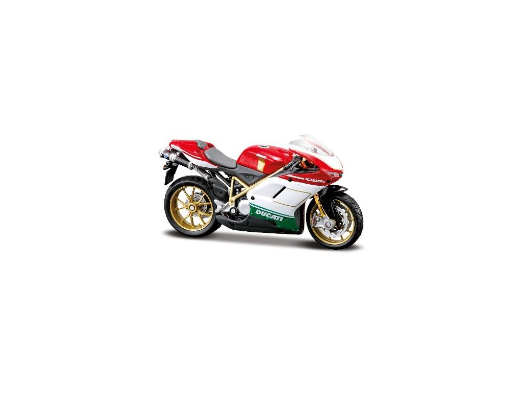 Ducati 1098 S Tricolore. Kovové modely motocyklů v modelovém měřítku 1:18. Motocykly mají otáčivá řídítka a odpruženou zadní nápravu. Jsou usazeny na černém plastovém podstavci. Rozměry balení: 16x10,5x7cm. Věk: 3+