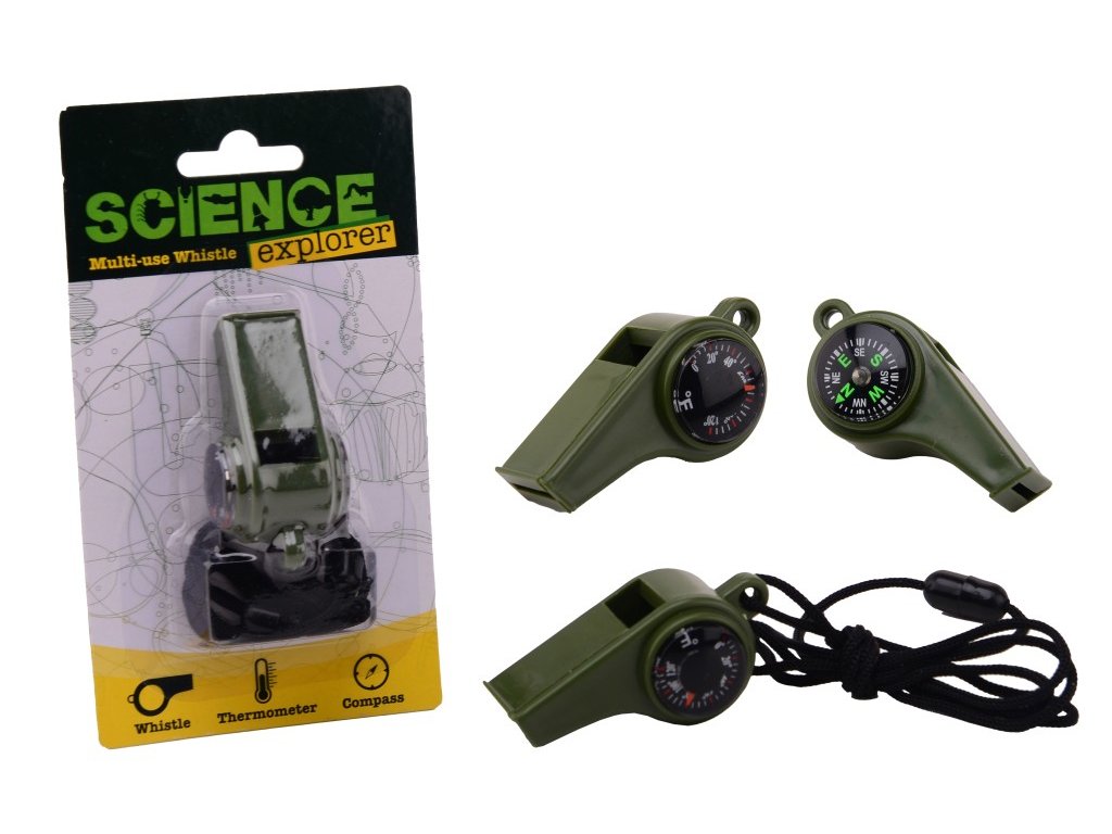 Multifunkční píšťalka má několik použití – jako píšťalka, teploměr a kompas.