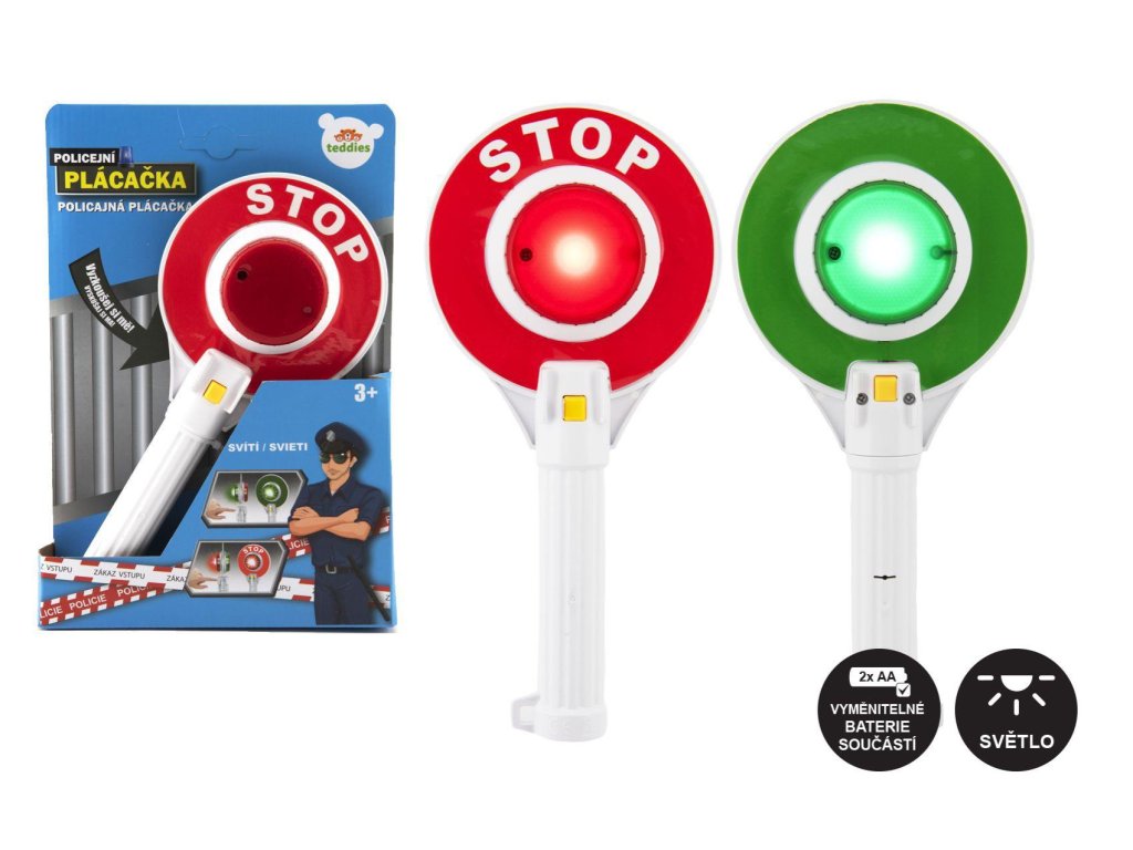 Policejní plácačka pro malé dopravní policisty, kteří potřebují řídit dopravu. Díky této svítící plácačce lehce zastaví všechna vozidla. Policejní svítící "plácačka" z plastu se světlem pro všechny malé policisty. Zastavovací terč učí děti základům silničního provozu. Přední strana terče svítí červeně a druhá zeleně. Baterie 2x AA jsou součástí balení. Rozměry balení 17 x 25 x 4 cm. Vhodné pro děti od 3 let.