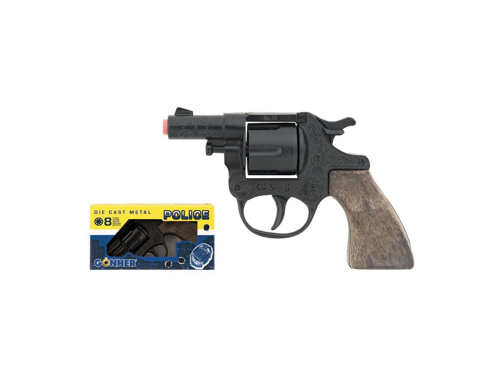 Kovbojský revolver stříbrný, kovový. Velikost revolveru 12,x7 cm. Vyrobeno ve Španělsku.