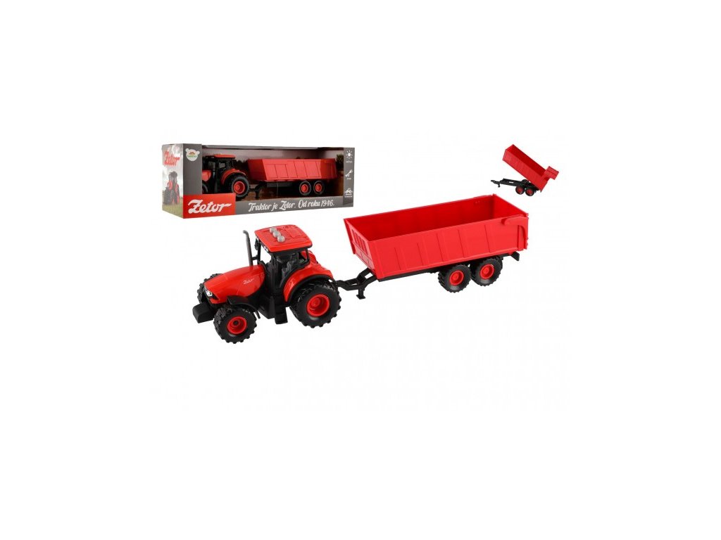 Krásný model zemědělského traktoru Zetor s dlouholetou tradicí, kterou musí milovat snad každý. Vyražte na pole s pořádným traktorem se světlem a zvukem! Traktor s valníkem je nepostradatelný pomocník pro každého malého farmáře! Valník můžeš jednoduše odpojit a traktor využít k dalším pracím. Traktor jezdí na setrvačník. Zmáčknutím tlačítek traktor vydává reálné zvuky a svítí mu světla. Hračka je na baterie 3x AG13, které jsou součástí balení. Velkost traktoru s valníkem: 36 cm Rozměr krabice: 39x13x13 cm Vhodné pro děti od 3 let