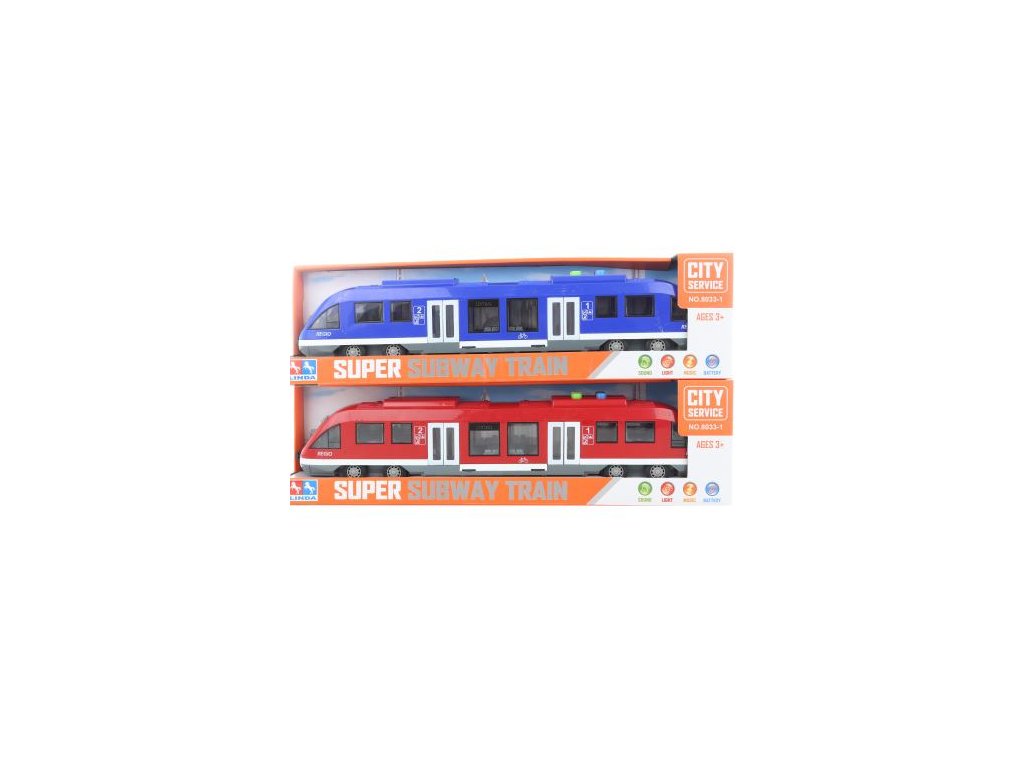 Plastový vlak (metro) na baterie. Po stisknutí tlačítek vydává zvuky a svítí. Napájení na 2 AA baterie (nejsou součástí). Vlak má otevírací dveře. Rozměry vlaku cca 43 x 8 x 5,5 cm. Rozměry balení cca 45,5 x 13 x 7,5 cm. Věk 3+
