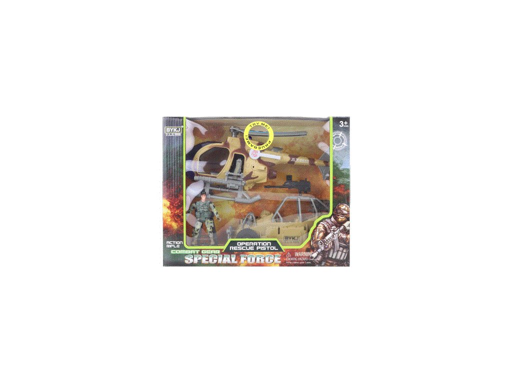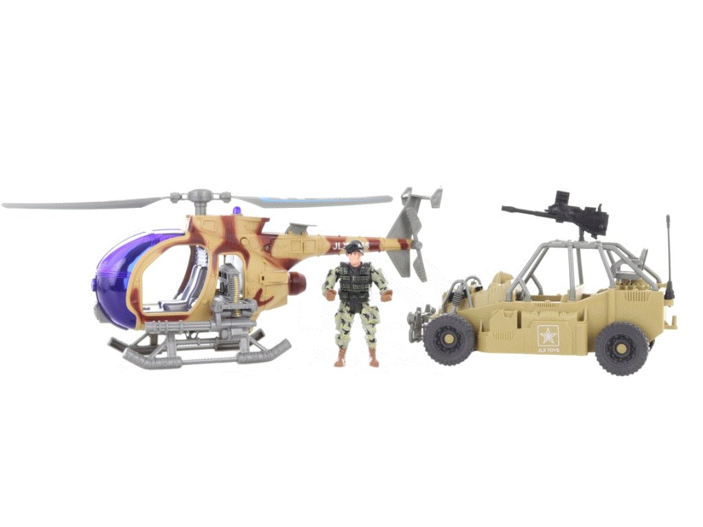 Vojenská sada na baterie obsahuje vrtulník, obrněné auto a vojáka. Po stisknutí tlačítka vrtulník vydává zvuky a svítí. Napájení 3x AG13/LR44 baterie - jsou součástí. Rozměr balení cca 32 x 25,5 x 10,5 cm. Věk 3+