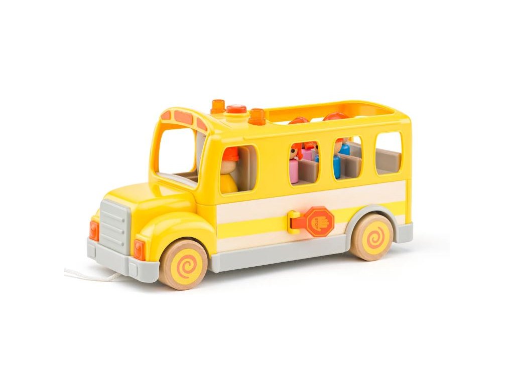 Školní autobus je vyroben v kombinaci kvalitního plastu a dřeva a obsahuje figurky řidiče a dětí. Má otvírací dvířka a vyklápěcí "stopku" pro bezpečný výstup a přechod silnice. Zmáčknutím tlačítka na kabině řidiče se aktivuje světlo azvuk.| Rozměr: 27 x 11,5 x 13,5 cm | Věk: 18m+, baterie 3 X LR44 1,5V jsou součástí
