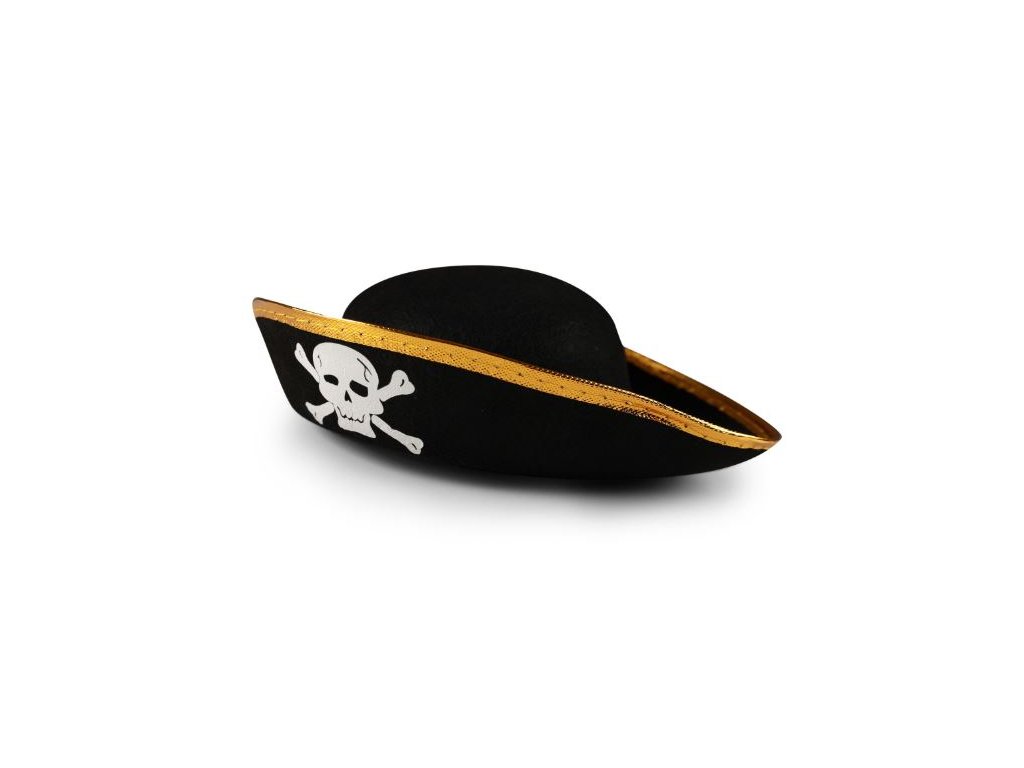 Úchvatný klobouk pro malé piráty! Tento černý klobouček je zdoben bílým potiskem s motivem lebky na přední straně a zlatým lemováním.