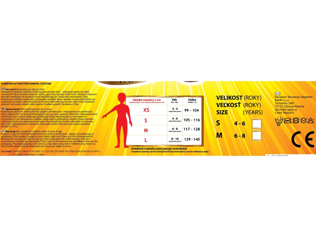 Nádherný kostým na Halloween pro všechny malé čarodějnice! Kostým fialovo-černé barvy ve velikosti S je určen pro holčičky ve věkovém rozmezí 3-6 let (105-116 cm). Šaty jsou dekorovány zlatým potiskem. Součástí kostýmu je perfektně sladěný čarodějnický klobouk. S tímto úchvatným kostýmem se zaručeně staneš hvězdou karnevalu i Halloweenu! Nejen letos je potřeba myslet EKO-nomicky i EKO-logicky! EKO-balení je vhodné zejména pro e-shopy kde zákazník nakupuje dle fotografie a není třeba velkého balení s věšákem. EKO-logicky – na balení bylo použito méně plastu a dalších materiálů. Jedná se o malý transparentní obal s fotografií. EKO-nomicky –EKO-obal zabere jen polovinu místa – šetřete skladová místa s námi!