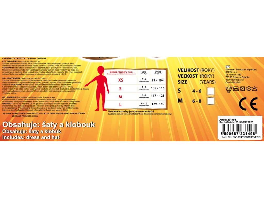 Nádherný kostým na Halloween pro všechny malé čarodějnice! Kostým růžovo-černé barvy ve velikosti S je určen pro holčičky ve věkovém rozmezí 3-6 let (105-116 cm). Šaty jsou dekorovány potiskem kočiček a netopýrů. Součástí kostýmu je perfektně sladěný čarodějnický klobouk. S tímto úchvatným kostýmem se zaručeně staneš hvězdou karnevalu i Halloweenu! Nejen letos je potřeba myslet EKO-nomicky i EKO-logicky! EKO-balení je vhodné zejména pro e-shopy kde zákazník nakupuje dle fotografie a není třeba velkého balení s věšákem. EKO-logicky – na balení bylo použito méně plastu a dalších materiálů. Jedná se o malý transparentní obal s fotografií. EKO-nomicky –EKO-obal zabere jen polovinu místa – šetřete skladová místa s námi!