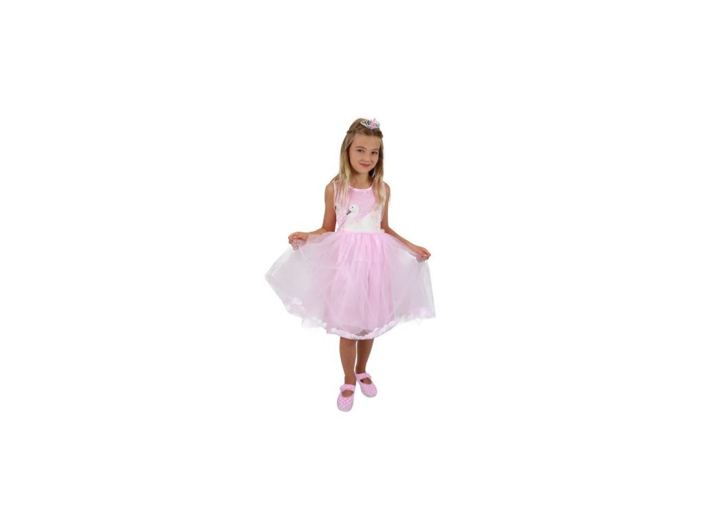 Okouzlující dívčí kostým pro princezny! Kostýmek růžové barvy je kombinován ve spodní části saténovou spodničkou, kterou překrývá růžový tyl, doplněný o okvětní lístky a sněhobílé kuličky. Horní část šatů je dekorována obrázkem labuťě. Kostým princezny ve velikosti S je určen pro holčičky ve věkovém rozmezí 4-6 let (110-116 cm).