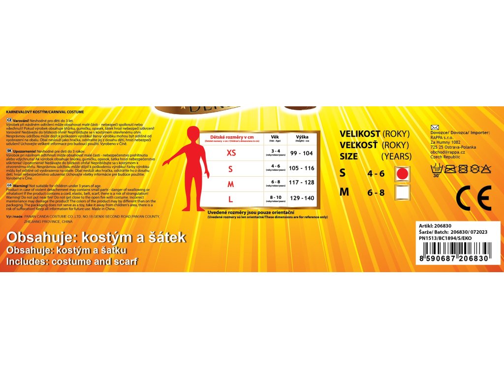 Staň se pirátkou, která má styl! Tento krásný saténový kostým s tylovou sukní je ozdoben páskem se zlatým potiskem s motivem lebek. Aby byl kostým kompletní, obsahuje šátek na hlavu ve stejném designu. Tento kostým ve velikosti S je vhodný pro děvčata ve věkovém rozmezí 4-6 let (110-116 cm). Nejen letos je potřeba myslet EKO-nomicky i EKO-logicky! EKO-balení je vhodné zejména pro e-shopy kde zákazník nakupuje dle fotografie a není třeba velkého balení s věšákem. EKO-logicky – na balení bylo použito méně plastu a dalších materiálů. Jedná se o malý transparentní obal s fotografií. EKO-nomicky –EKO-obal zabere jen polovinu místa – šetřete skladová místa s námi!