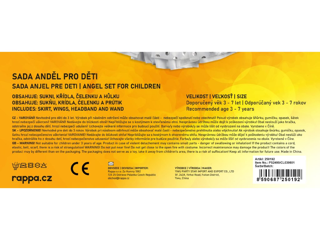 Roztomilá souprava pro všechny malé andílky! Kostýmek bílé barvy je určen pro holčičky ve věkovém rozmezí 3-7 let. Balení obsahuje nadýchanou sukničku zdobenou stříbrnými puntíky, perfektně sladěná křídla, čelenku s peřím a hůlku.