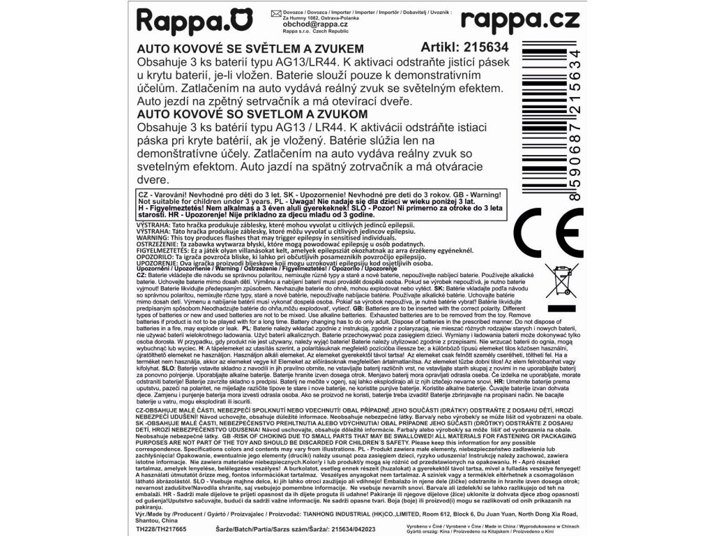 Kovová sanitka po zmáčknutí svítí a vydává zvuk. Boční i zadní dveře se dají otevřít. Funguje na 3 x 1.5 V AG13 baterie.