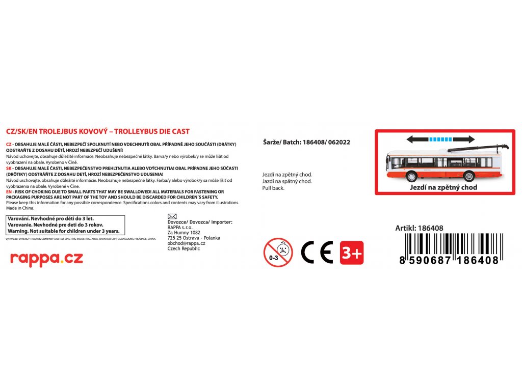Kovový trolejbus v červeno-bílém provedení je unikátní hračkou, která nadchne všechny malé i velké fanoušky dopravních prostředků. Trolejbus je dlouhý 16 cm a jezdí na zpětný chod.