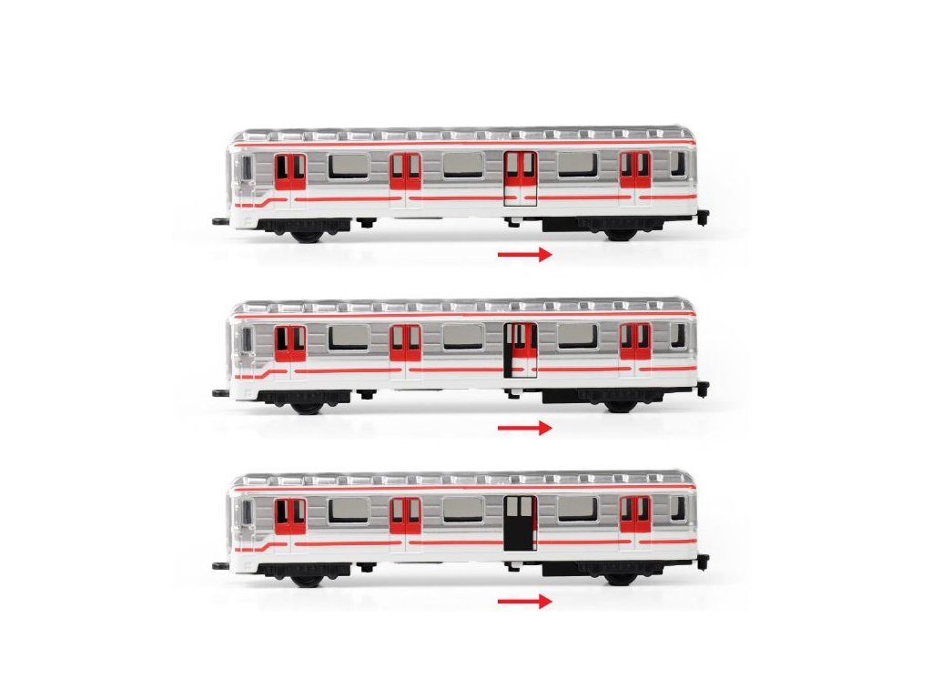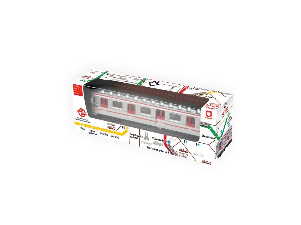 Originální hračka vytvořená ve spolupráci s hlavním městem Praha a Dopravním podnikem hlavního města Prahy. Délka metra je 16 cm. Tento jedinečný kousek v měřítku 1:110 se určitě stane oblíbenou hračkou všech malých nadšenců městské hromadné dopravy nejen v Praze. Navíc lze jednotlivé soupravy jednoduše zapojit za sebou. Jedny dveře metra je možné otevřít, pomocí páčky ve spodní části vozu. Jezdí na zpětný chod. Metro má rozchod kol cca 1,5 cm.