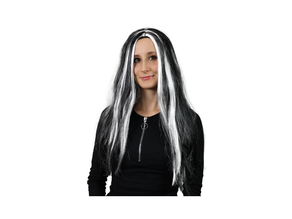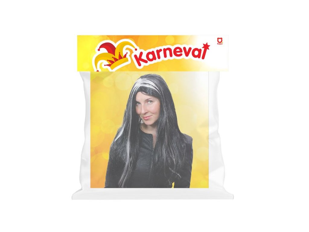 Karnevalová paruka v motivu čarodějnice. Paruka má dlouhé černé vlasy a je dekorována stříbrným melírem. Perfektní doplněk ke kostýmu! Vhodné i k oslavě Halloweenu.