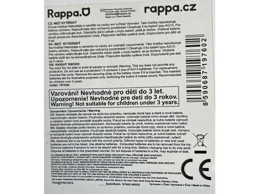 Chystáš se na souboj v rytířském klání? Tak tento meč je pro tebe naprosto ideální. Meč s bronzovou rukojetí a stříbrnou čepelí je dlouhý cca 55 cm a vydává zvuky. Obsahuje 3 ks baterií typu LR44.