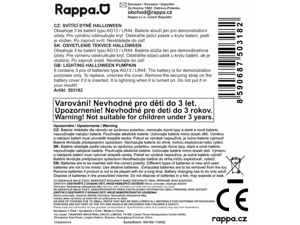 Halloweenské svítidlo na tu pravou Halloween párty! Plastová dýně s rukojetí již obsahuje baterie (3ks baterie AG13/LR44). Stačí jen přepnout přepínač ve spodní části dýně. Zažij tu pravou halloweenskou atmosféru! Tato hračka je pouze se světlem! Velikost dýně cca 10 cm.