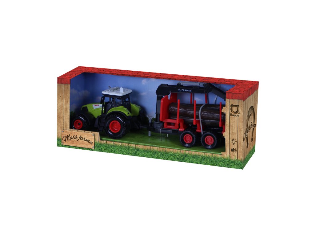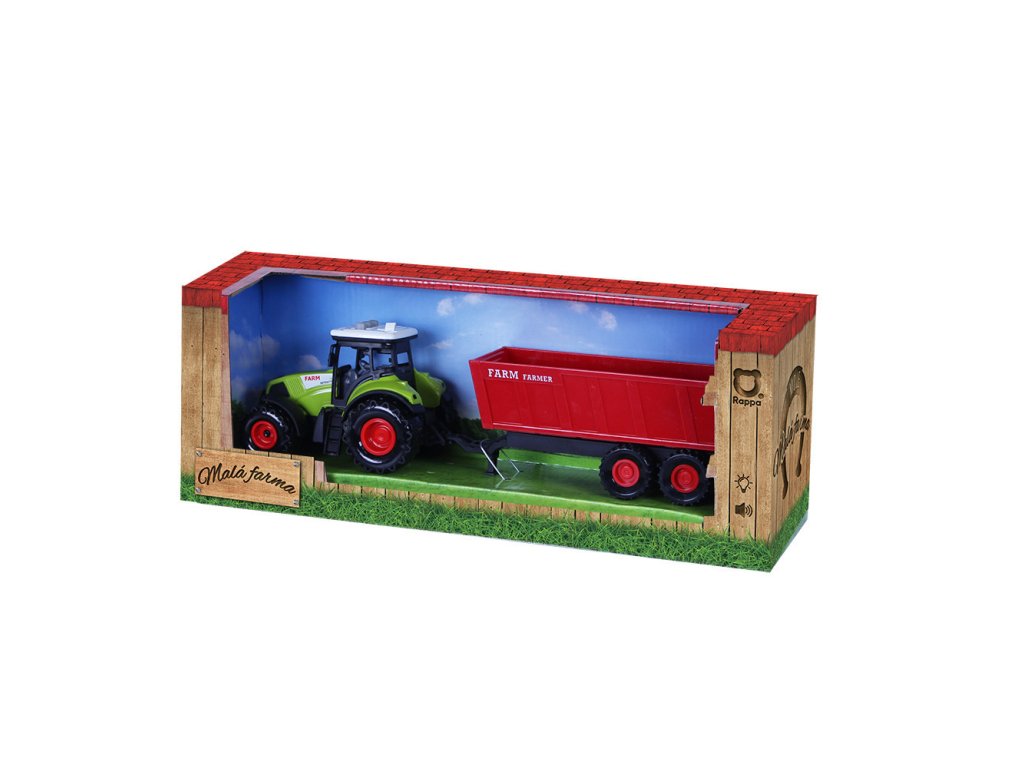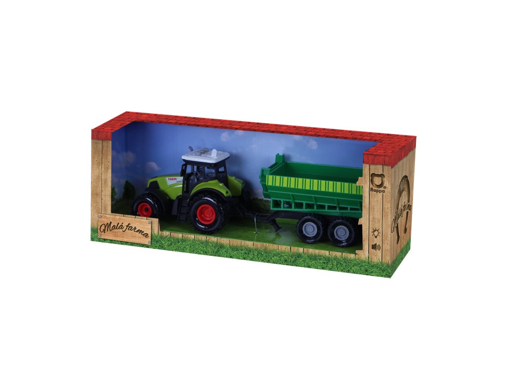 Moderní plastový traktor s vlečkou, hračka z kolekce Moje malá farma. Nepostradatelný pomocník pro každého malého farmáře! Vlečku můžeš jednoduše odpojit a traktor využít k dalším pracím. Traktor jezdí na setrvačník a jeho délka včetně přívěsu je 37 cm. Zmáčknutím tlačítek traktor vydává reálné zvuky. Traktor vyžaduje 3 ks baterií typu AG13/LR44, které jsou součástí balení.