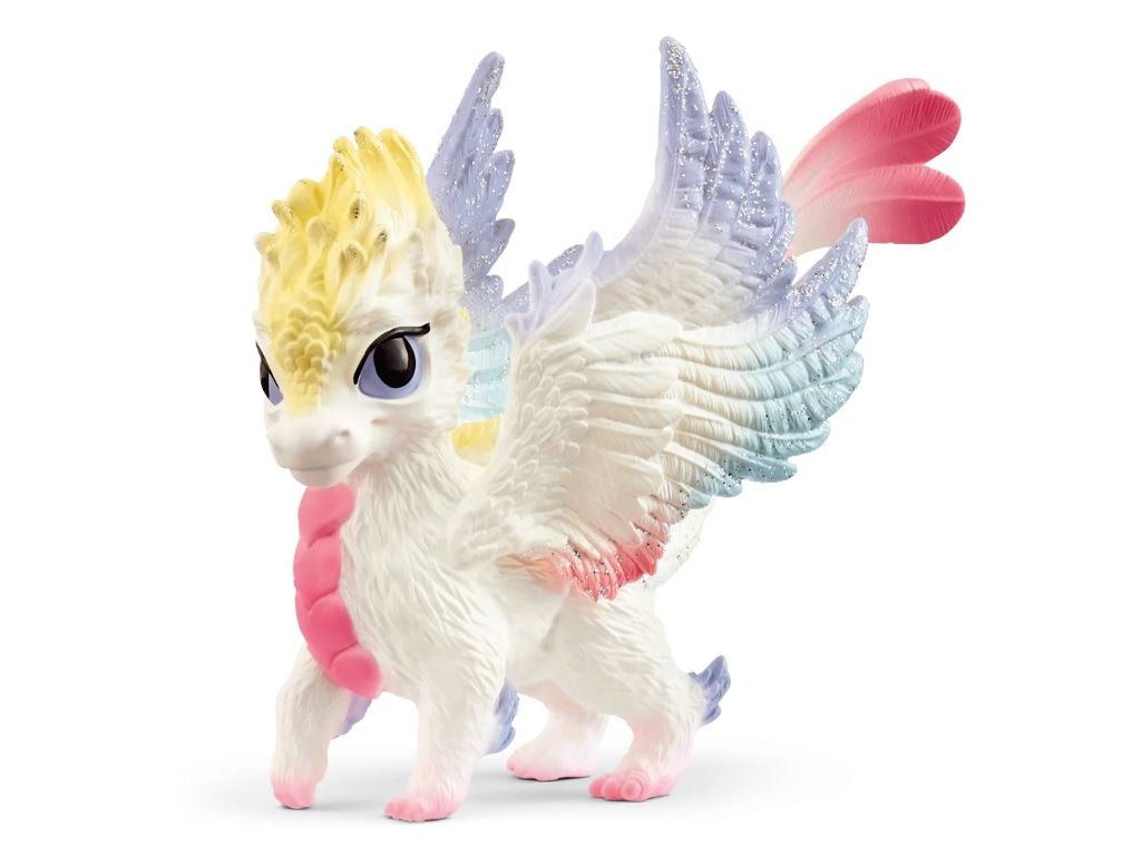 Malý duhový dráček dokáže ve světě BAYALA® svými mávajícími křídly vytvářet krásné duhy. Duhový dráček má nejraději deštivé dny, ale stejně tak si užívá i ty slunečné. Nejlepší jsou ty dny, kdy prší a svítí slunce zároveň, protože tehdy se objeví duha. Malý duhový dráček se už nemůže dočkat, až vyroste a proletí se nad světem BAYALA® jako velký duhový drak. Duhový dráček s velkýma fialovýma očima vypadá jako úplné neviňátko. Ale nenechej se zmást, tenhle drobeček se umí pořádně ohánět. Navzdory tomu, jak roztomile se svou citronově žlutou chocholkou vypadá. Díky lesklým křídlům dokáže obratně létat po obloze světa BAYALA®, dělat na obloze salta a provádět nejrůznější triky. Až vyroste, dokáže dokonce na obloze namalovat duhu! Kdo by to byl řekl. Duhový dráček je sice ještě malý, ale když prolétá světem BAYALA®, tak už teď přitahuje pozornost všech kolem. Jeho bílý plášť zdobí všechny barvy duhy: Na hlavě má citronově žlutou chocholku, přes hruď růžový pruh a špičky křídel se mu třpytí růžově, světle modře a tyrkysově. Krása, která bere dech. Tento výrobek schleich® patří do tematického světa BAYALA® a je vhodný pro děti ve věku od 5 do 12 let. Rozměry figurky: 7,4 x 6,4 x 9,7 cm.